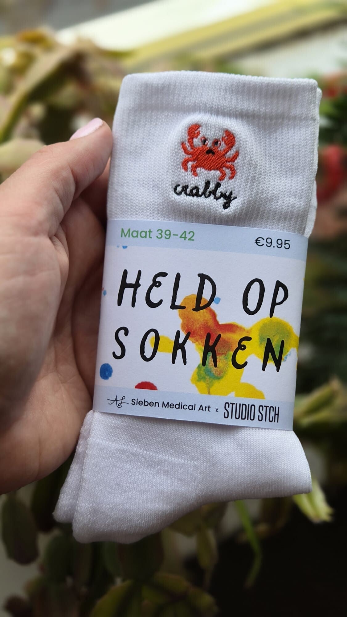 Soms heb je van die dagen dat je je even terug wilt trekken in je schulp. Met deze ‘Crabby’ sokken uit de exclusieve collectie van Sieben Medical Art x Studio STCH doe je dat in stijl. Dit grappige en kleurrijke ontwerp brengt direct een glimlach op je gezicht, zelfs als je even niet zo'n zin hebt in de wereld.