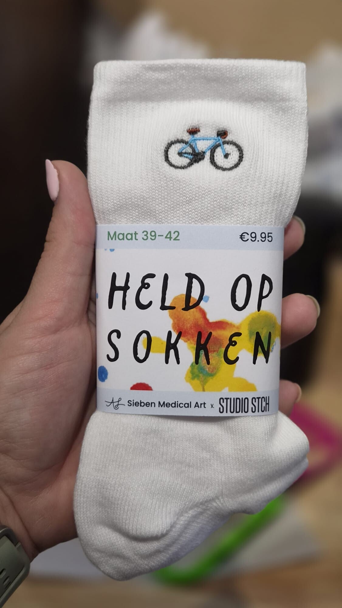 Dit sportieve ontwerp is tot stand gekomen in een exclusieve samenwerking met Sieben Medical Art. Het blauwe fiets-icoon is speciaal voor Studio STCH getekend, wat deze sokken tot een uniek en betekenisvol accessoire maakt voor elke fietsfanaat.